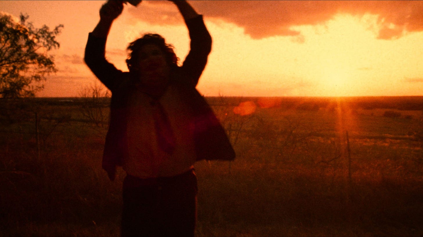 A cena final de The Texas Chain Saw Massacre é um dos momentos mais arrebatadores e enigmáticos: um encerramento que transcende o gênero e se eleva à categoria de pura arte visual.